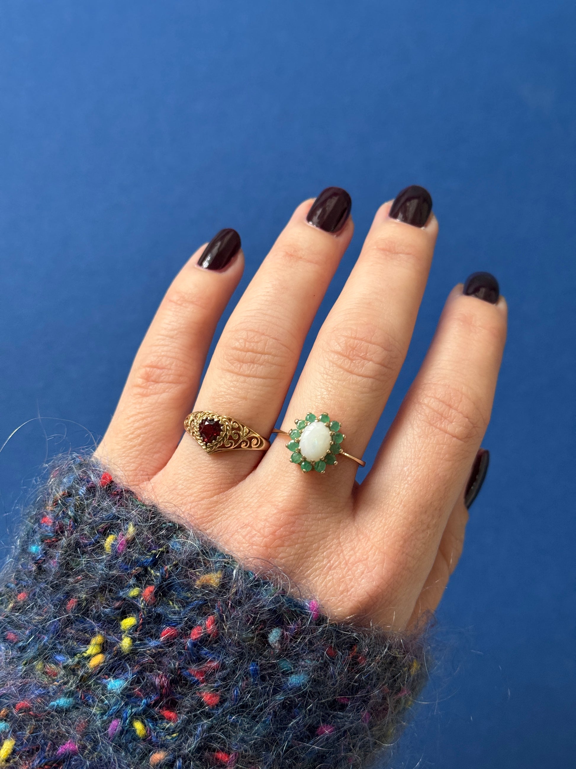 Beautiful vintage garnet heart ring with open engraved band. Can also be worn as a pink ring.