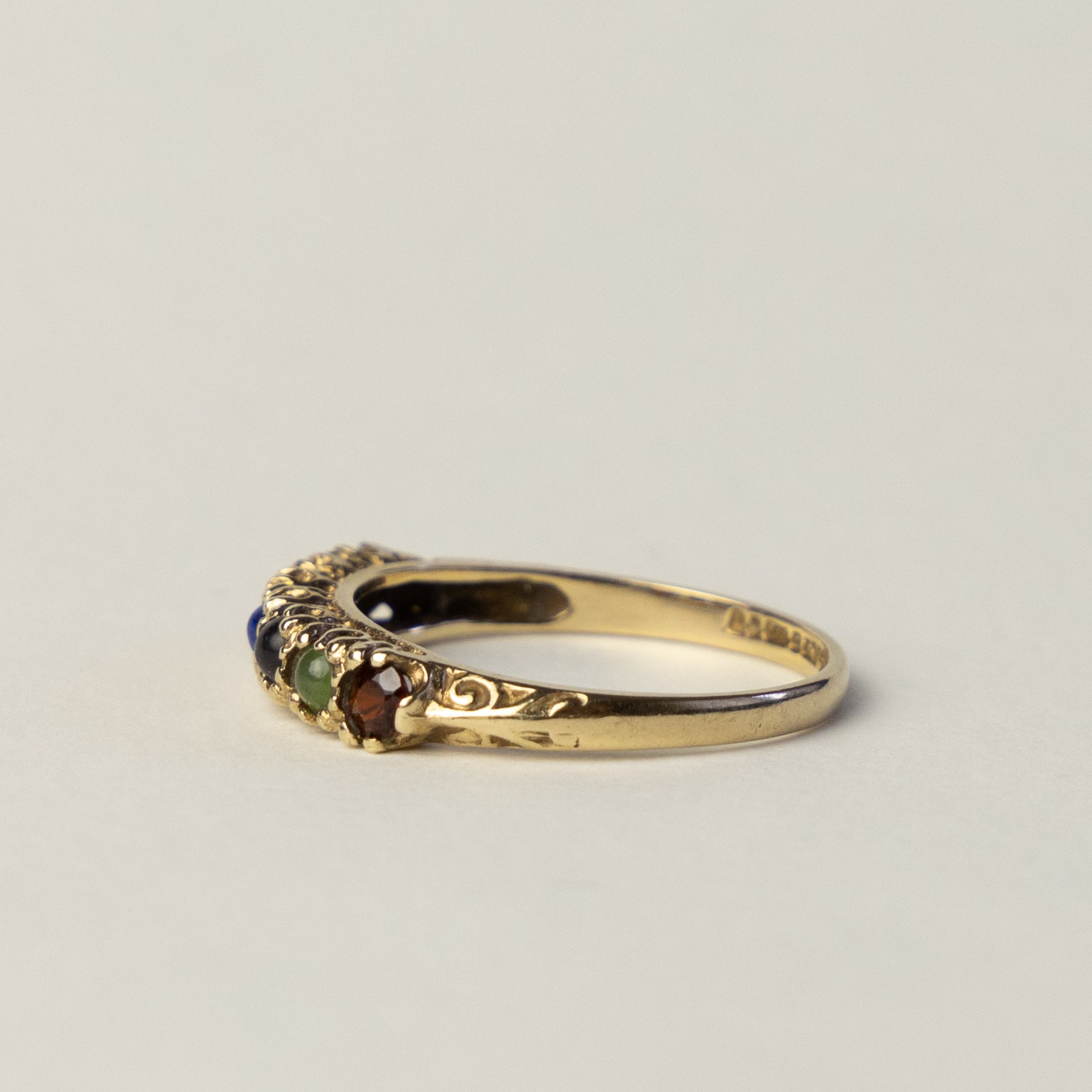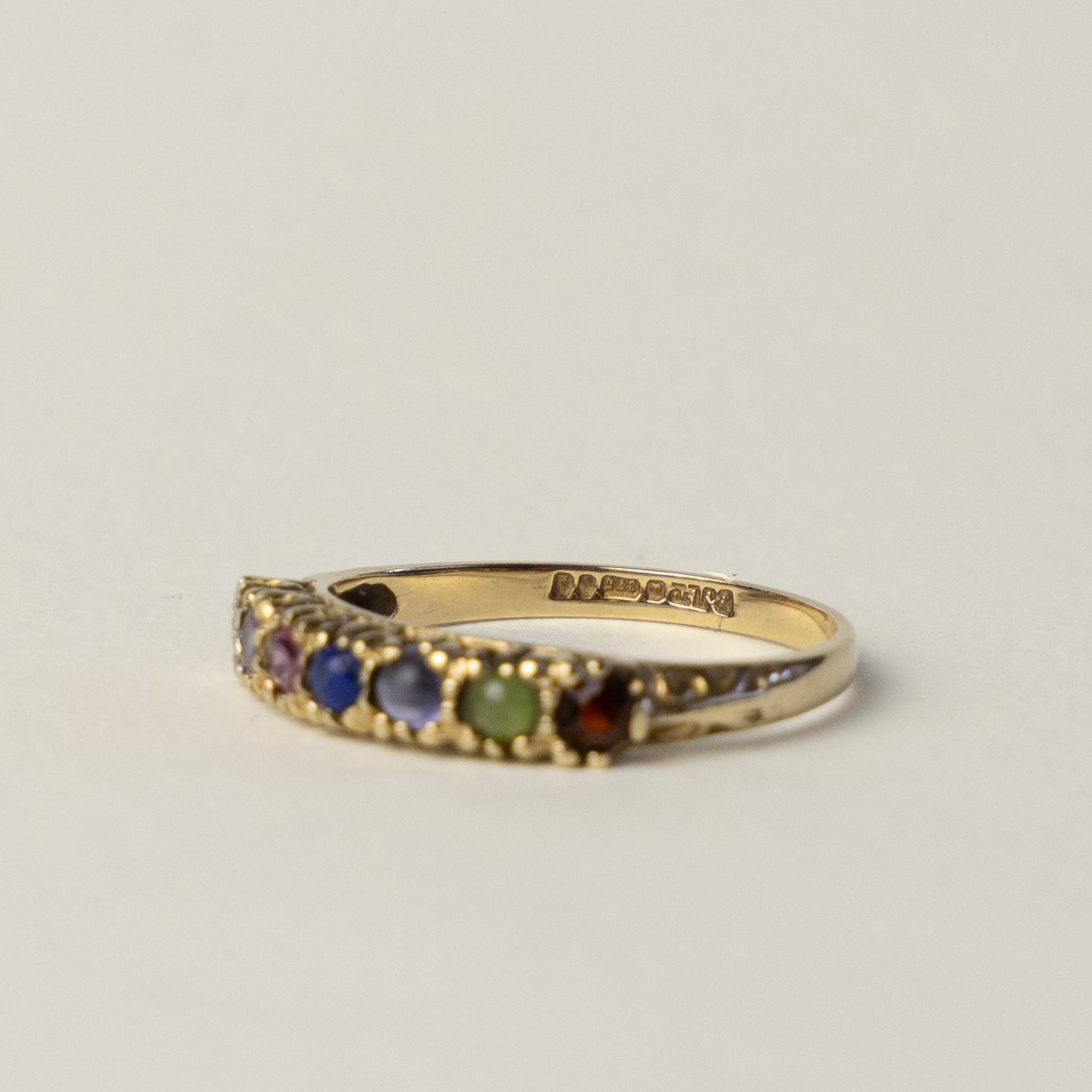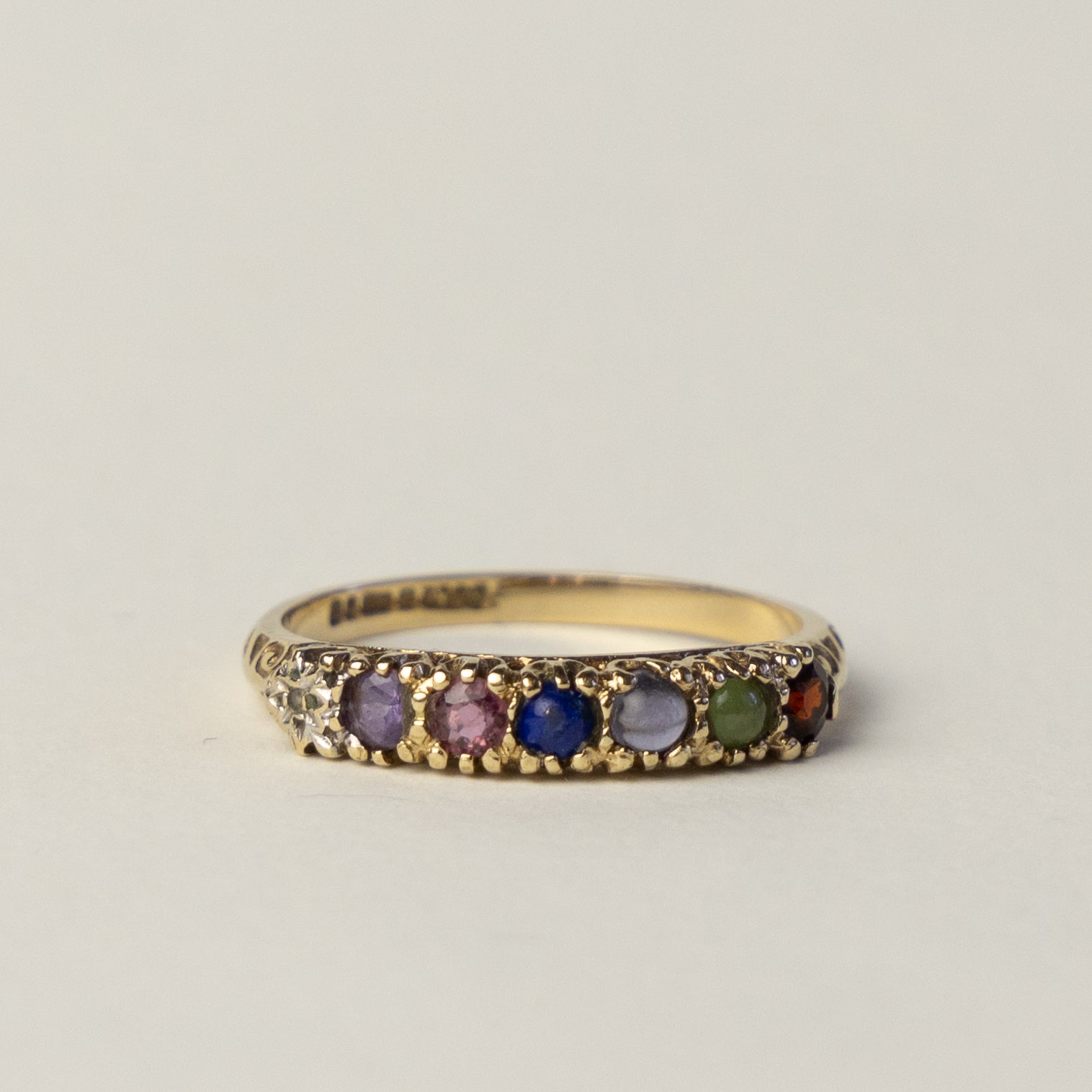 Very unique vintage 9 carat gold 'DARLING' gold ring. This very romantic vintage ring would have been a sentimental gift given to a loved one as a token of affection, and to demonstrate that the giver regarded them as their 'darling'. Each gemstone represents a letter of the word ‘darling’.