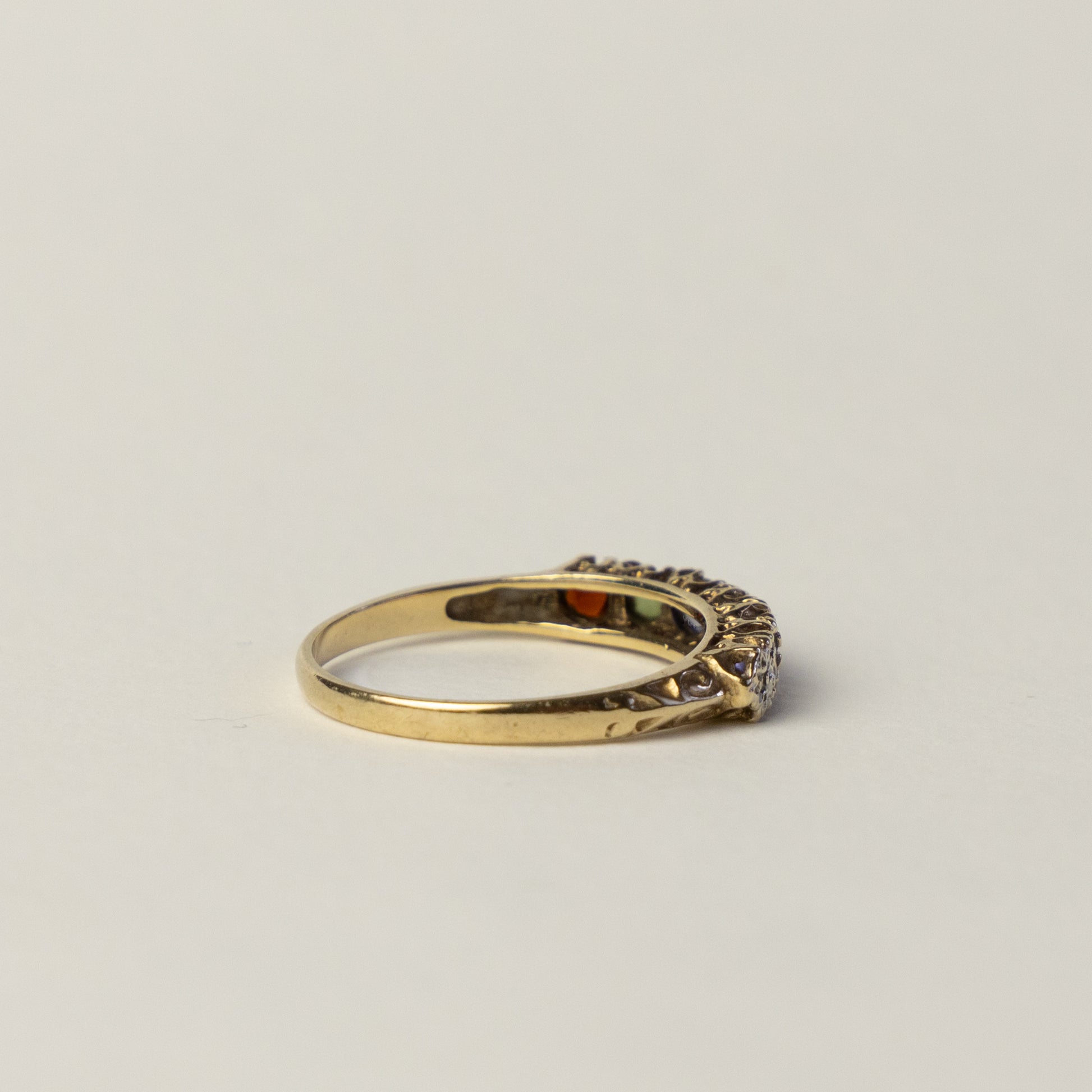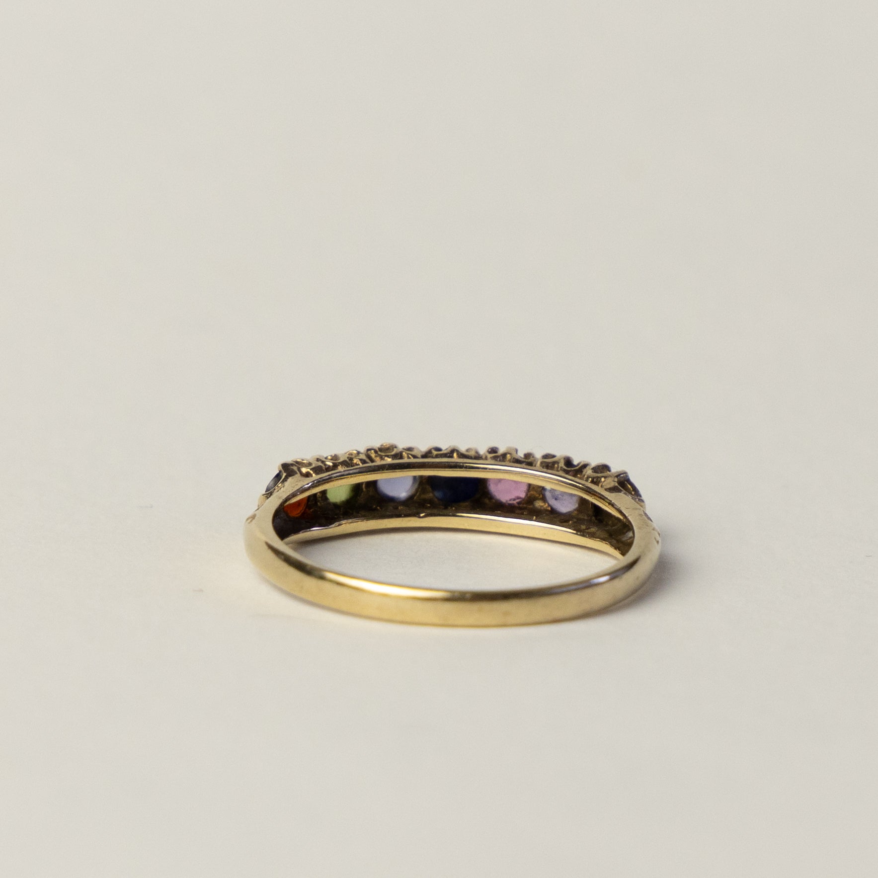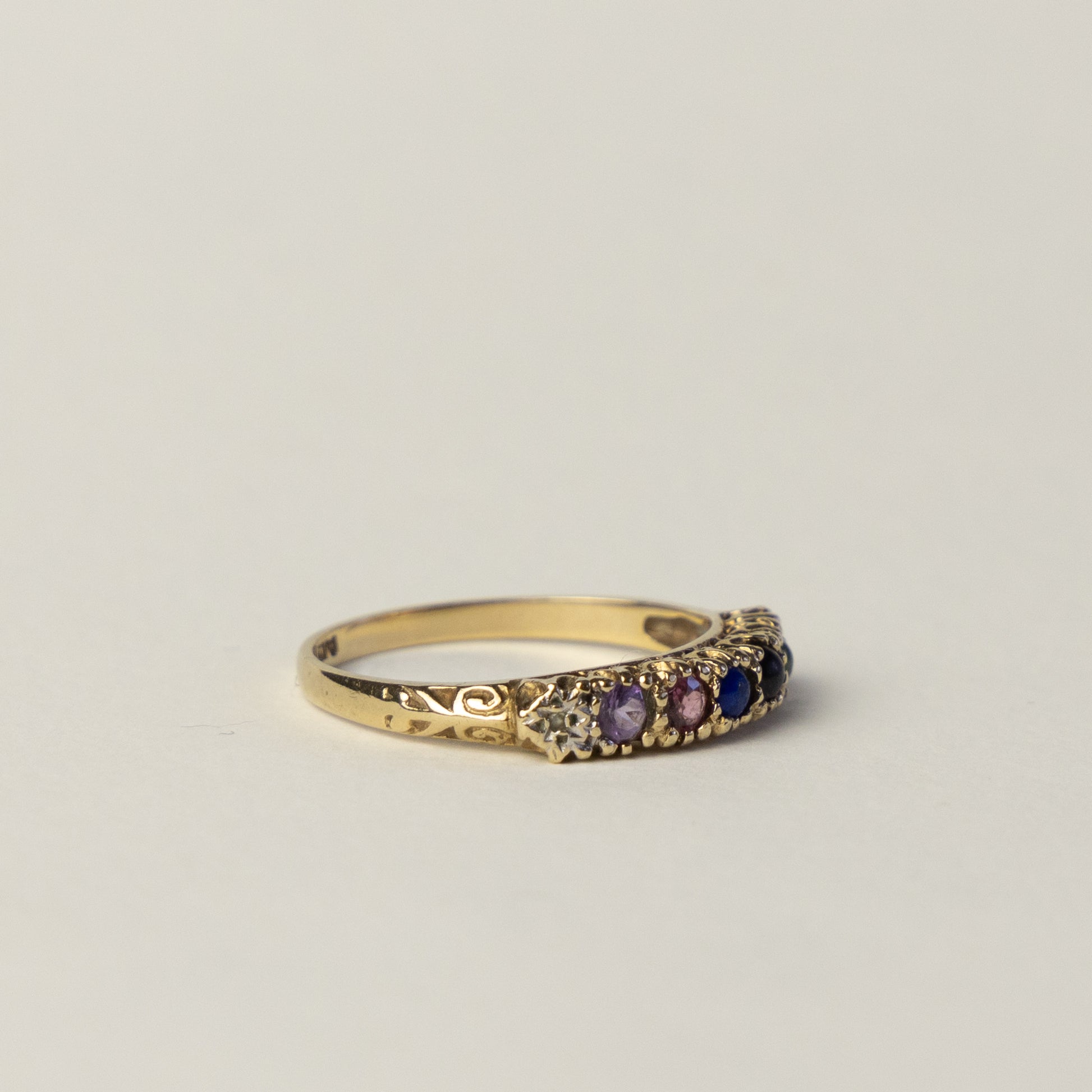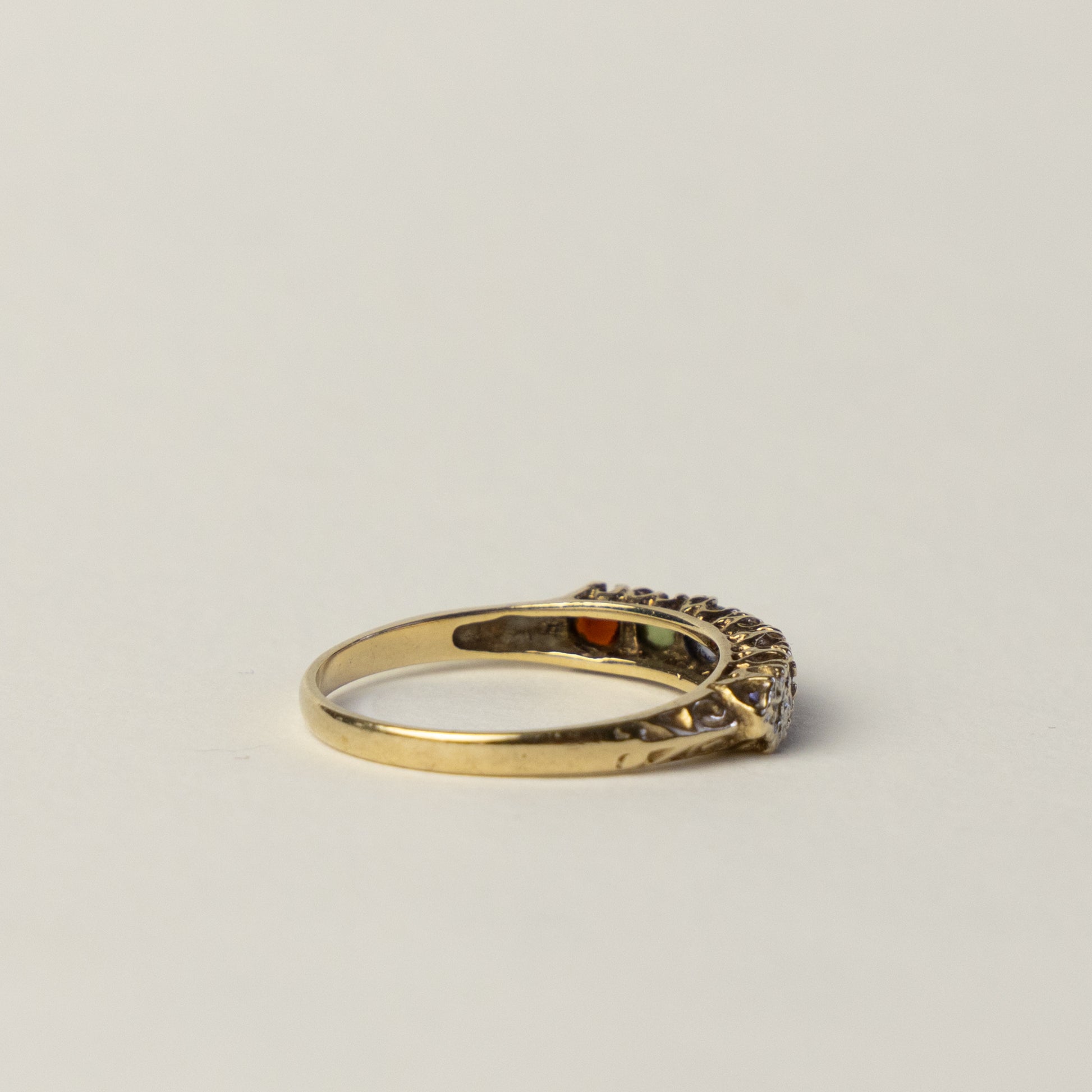 Very unique vintage 9 carat gold 'DARLING' gold ring. This very romantic vintage ring would have been a sentimental gift given to a loved one as a token of affection, and to demonstrate that the giver regarded them as their 'darling'. Each gemstone represents a letter of the word ‘darling’.