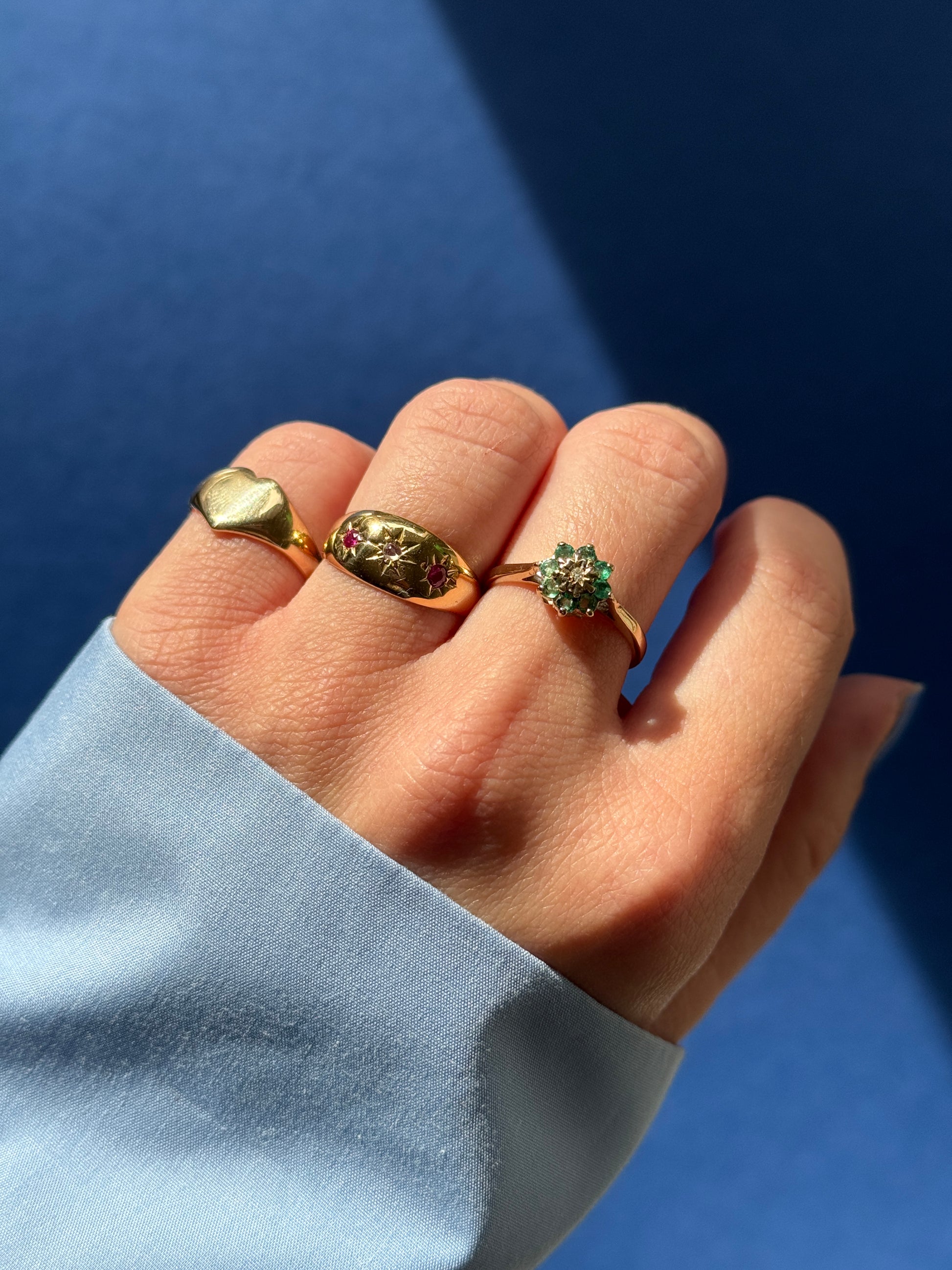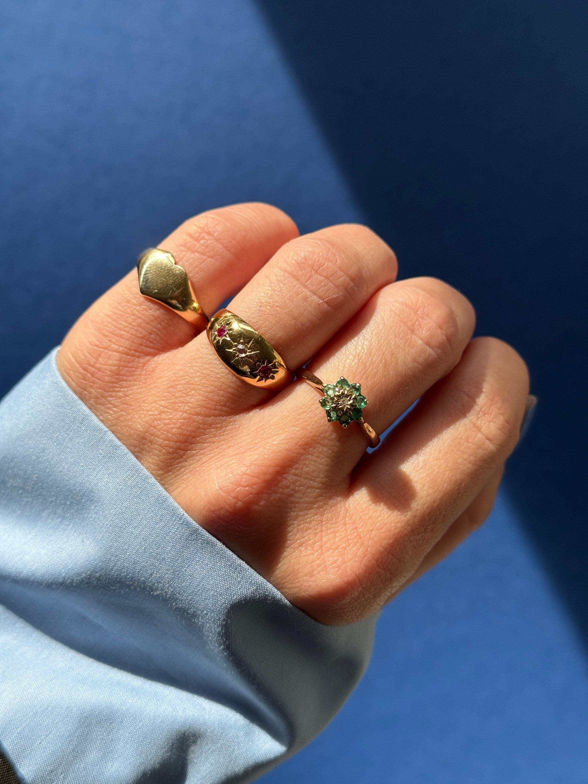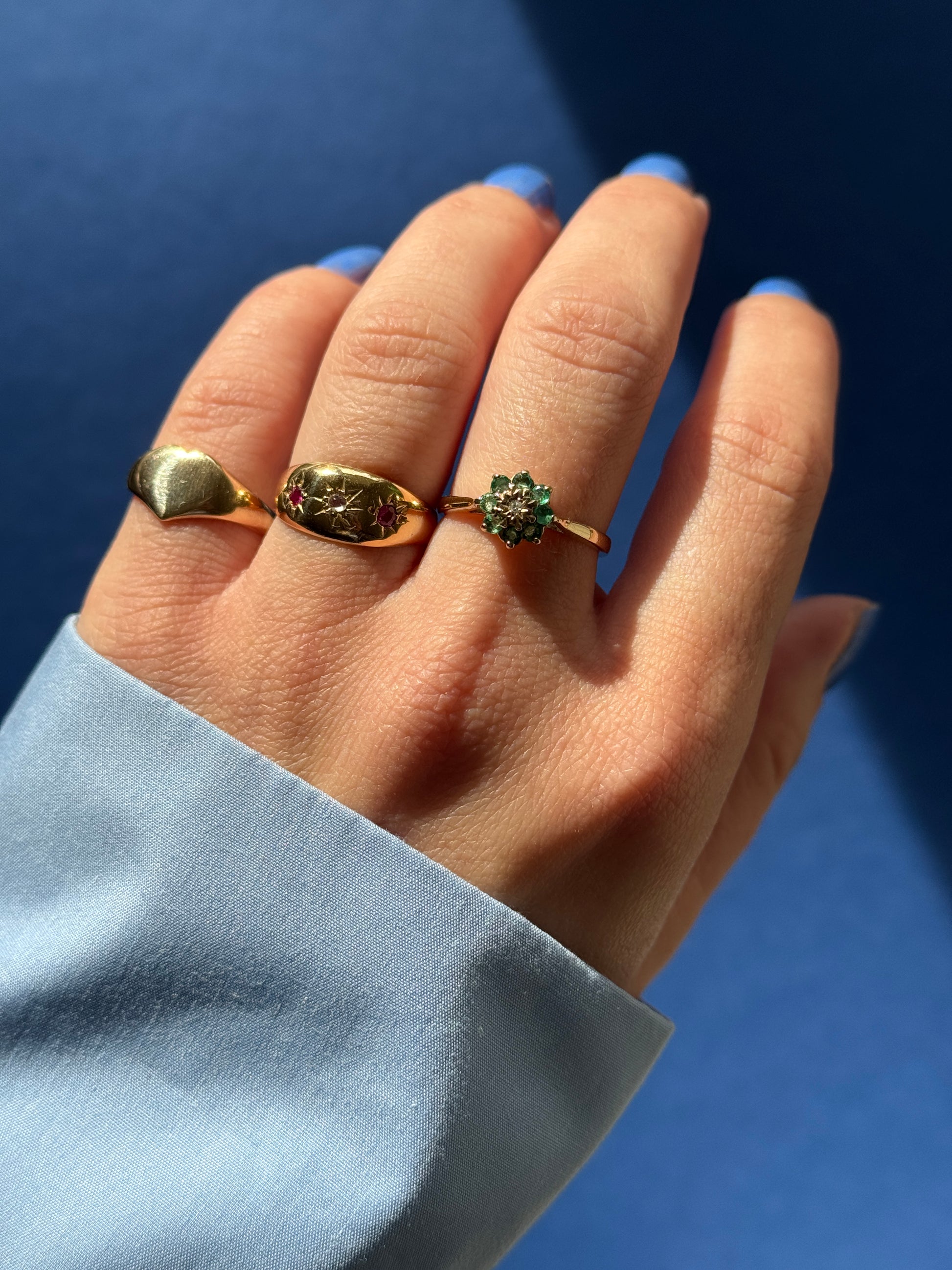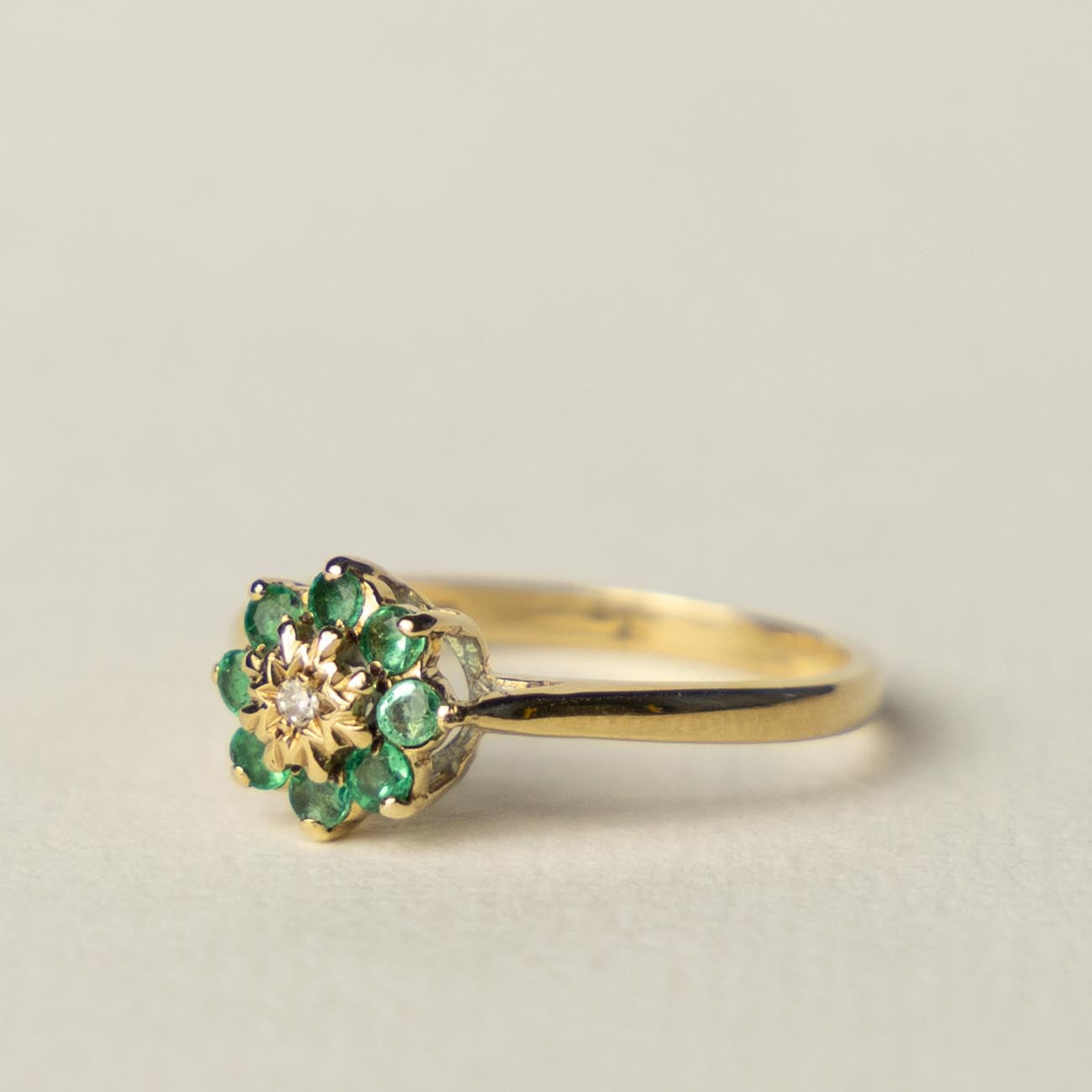 Beautiful vintage flower cluster ring with emeralds and one diamond in the middle.