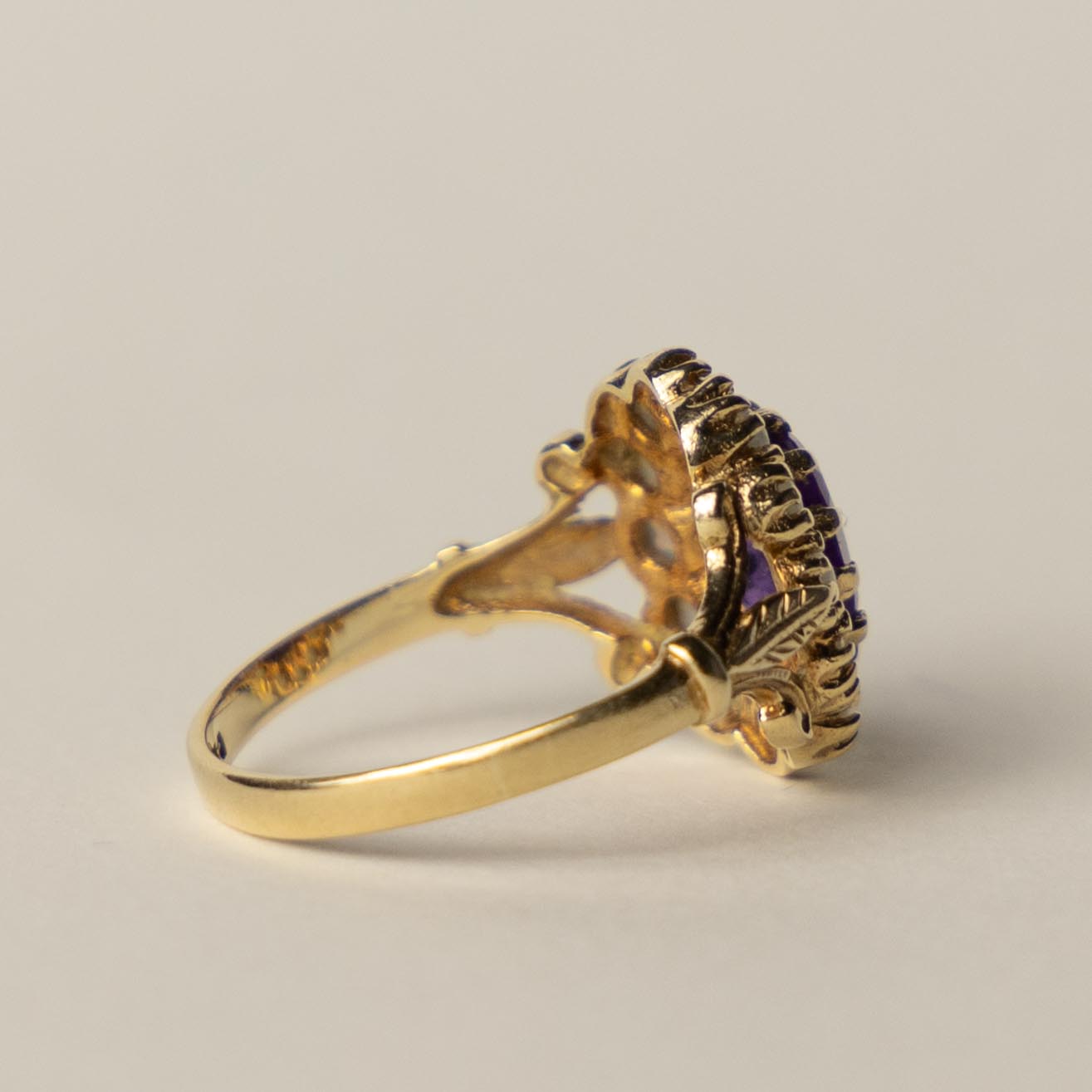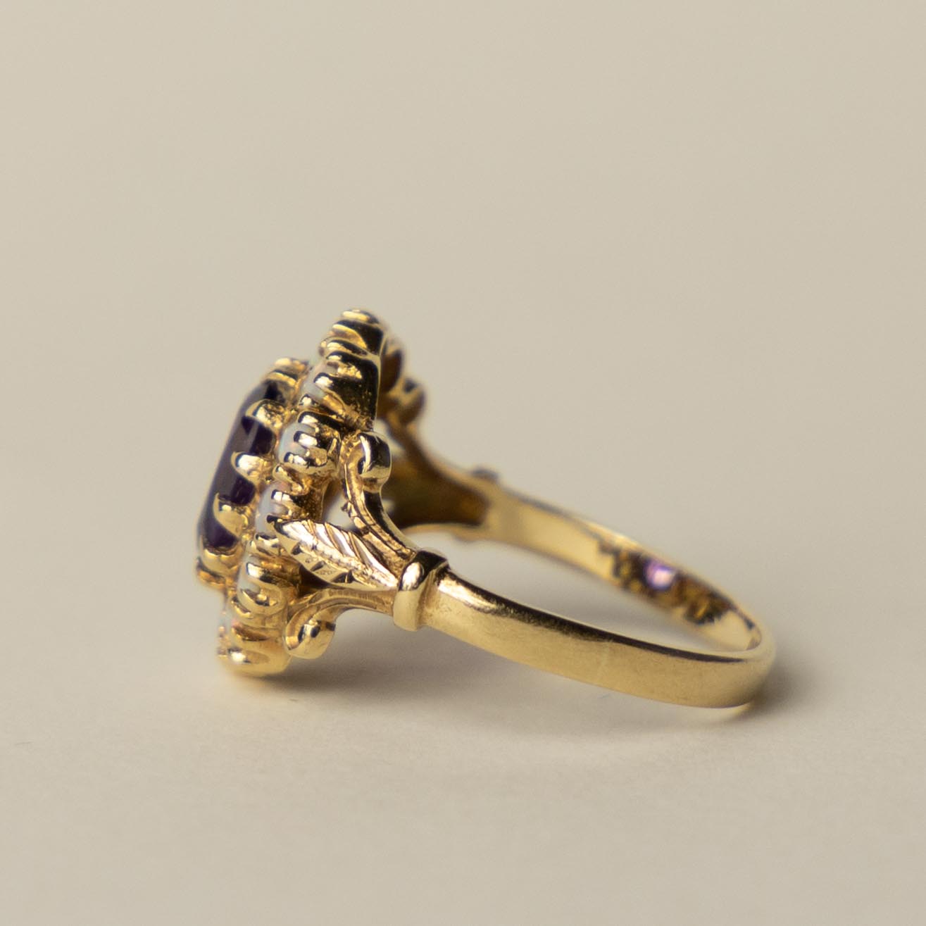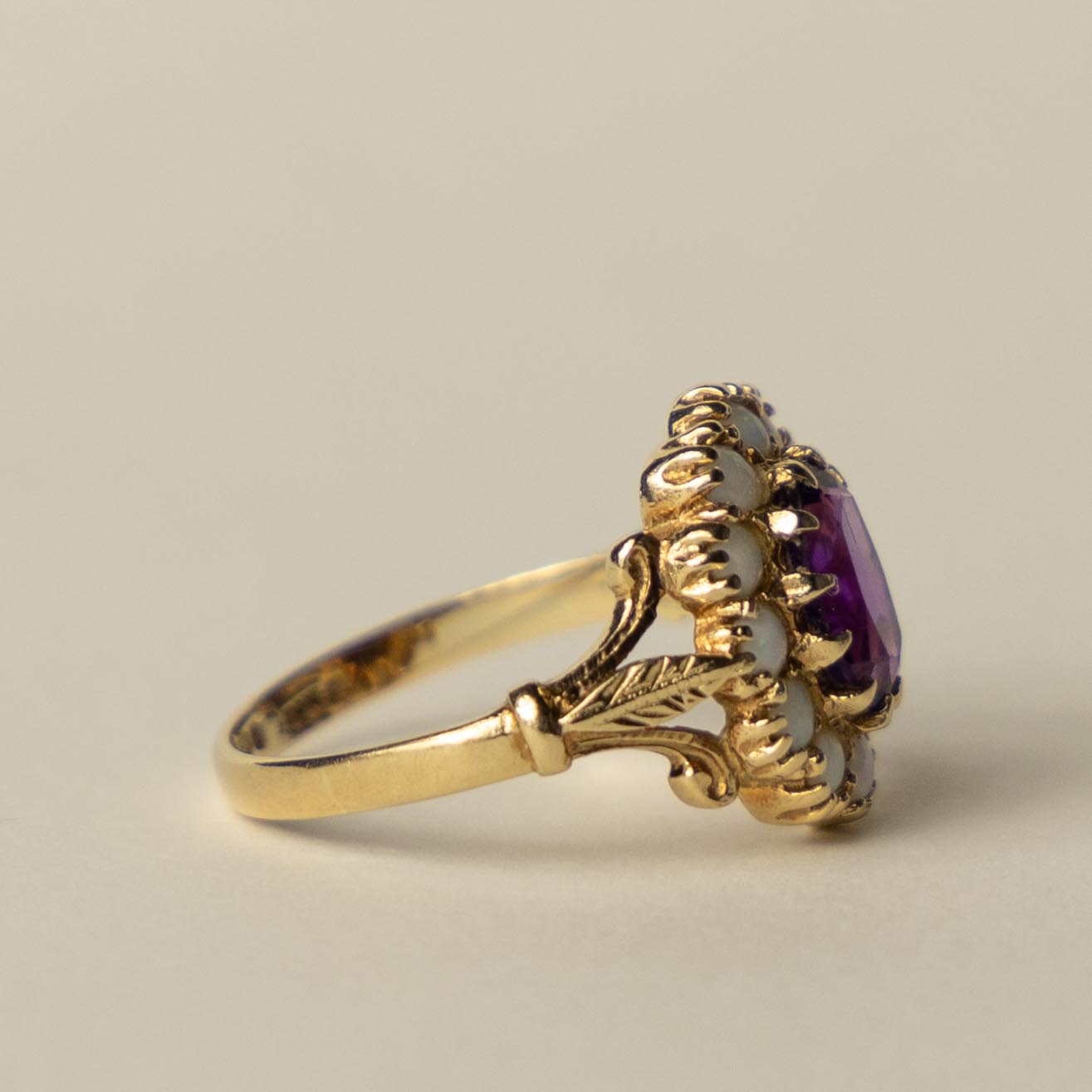 Beautiful and unique vintage 9ct amethist and opal ring. The design is beautifully inspired by the Victorian era. The amethyst has a minor scratch (see last picture), which is indicated in the price. Not very visible.
