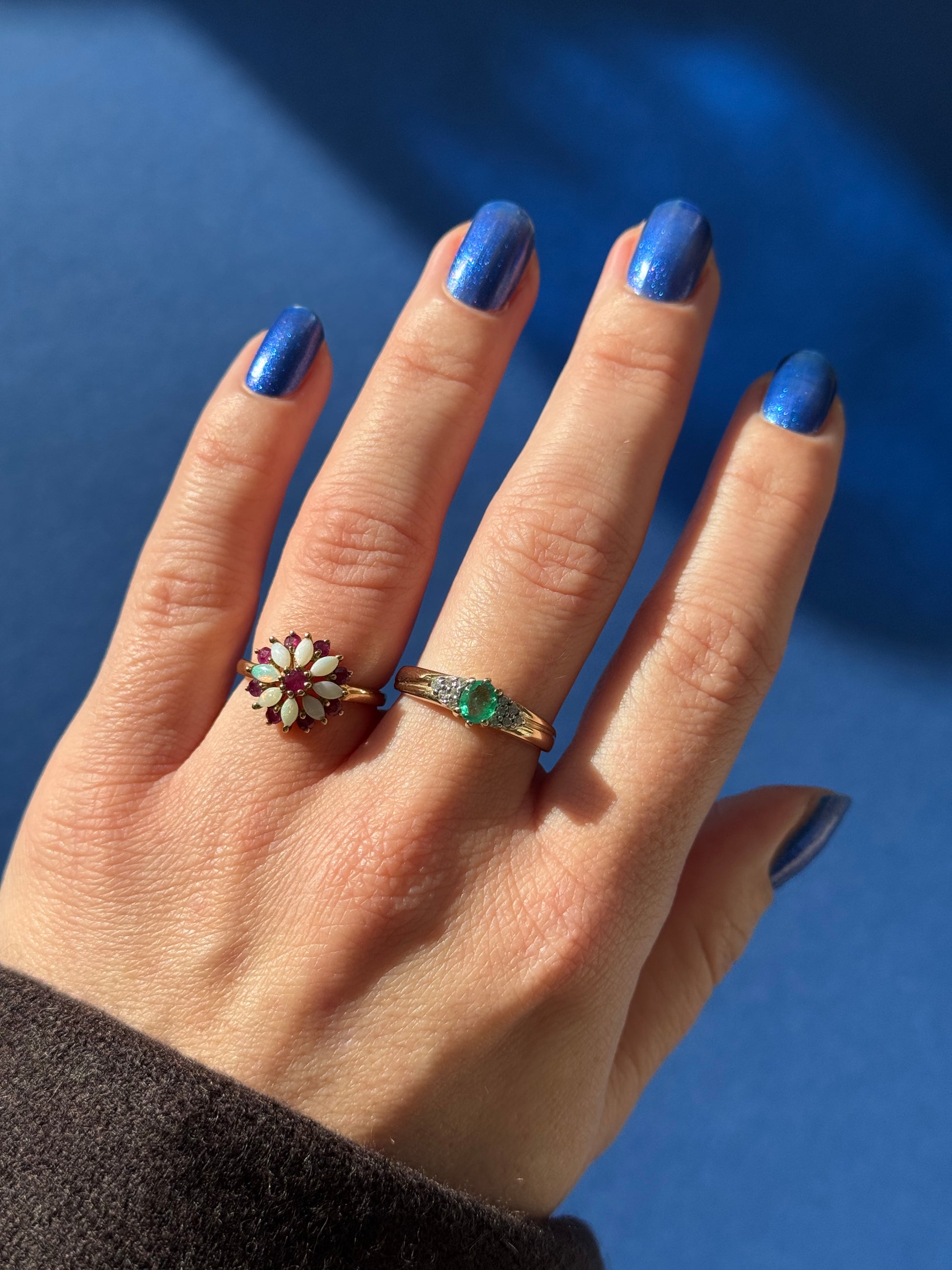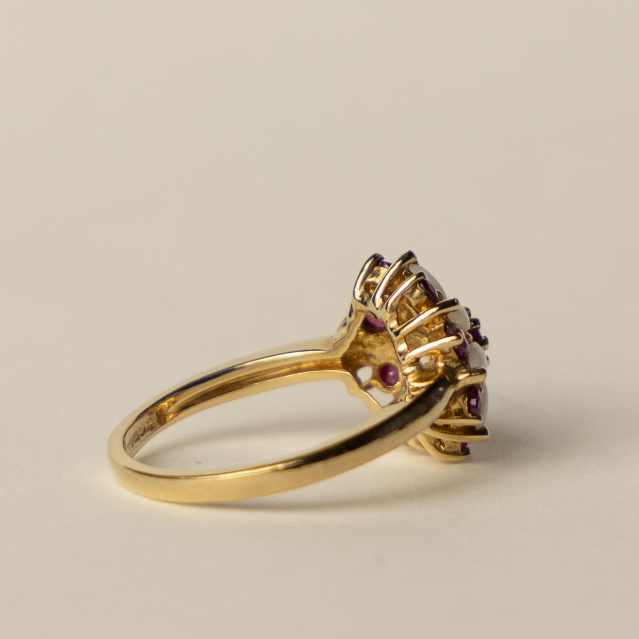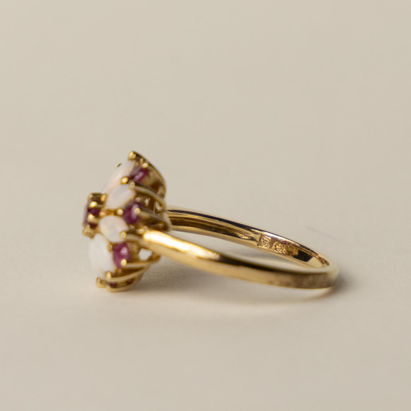 Beautiful vintage 9ct ruby opal flower cluster ring
